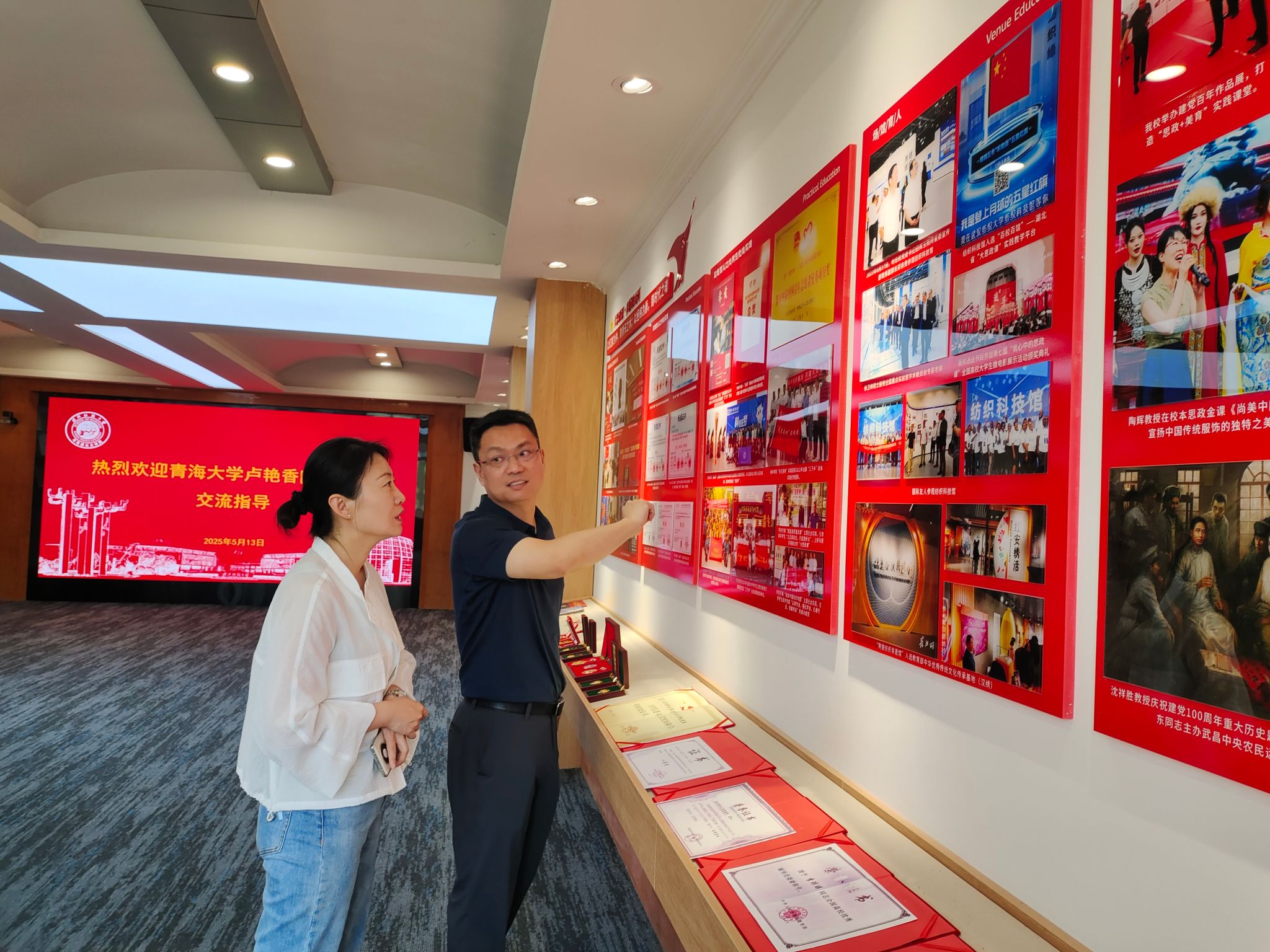 会后,卢艳香院长一行参观了学院的教学设施、陈列馆以及我校荆楚纺织非遗馆,进一步了解了我校的办学特色和文化底蕴。