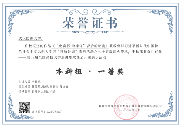WilliamHill官方网站紧扣立德树人根本任务,扎实推进教学改革与质量提升。育人成果持续涌现,2项成果分获中国纺织工业联合会教学成果特等奖和一等奖,2项学生作品获国家级学科竞赛一等奖,2项成果代表学校参与湖北省教学成果奖评选。教师教学能力持续增强,陈慧获湖北省思政课教学展示活动特等奖并成功入选全国比赛,陈春兰教师湖北省青年教师教学竞赛优秀奖。教学特色与影响力进一步彰显,获省级研究生教改项目立项,教改举措获《中国科学报》《中国教育报》等媒体专题报道。