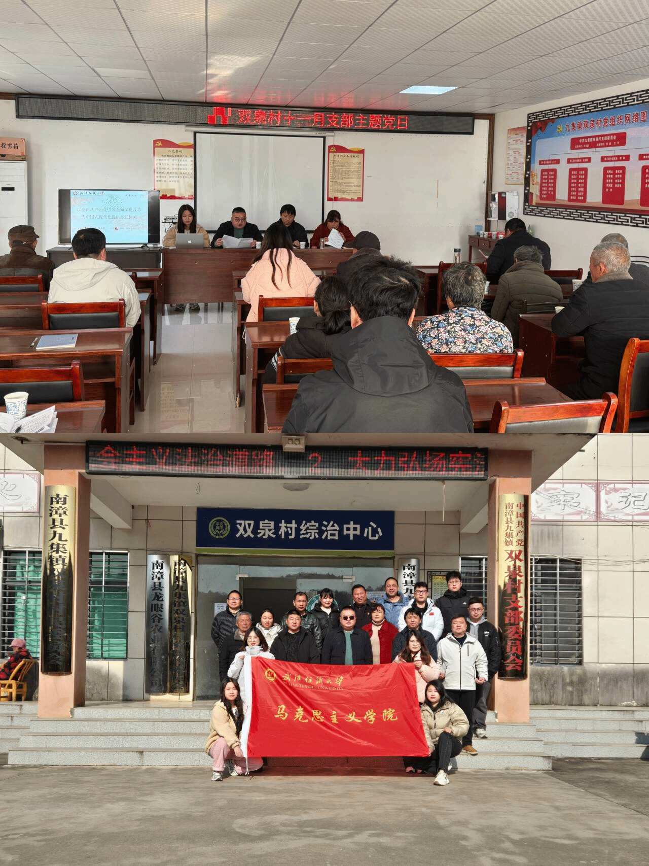 12月7日上午,师生团队与南漳县九集镇双泉村党支部,围绕“学习贯彻习近平总书记考察湖北精神,奋力实现全年目标”主题,展开了一场深刻的支部主题党日活动。活动紧扣回归初心、政治学习、民主议事、实践锻炼四大环节展开。