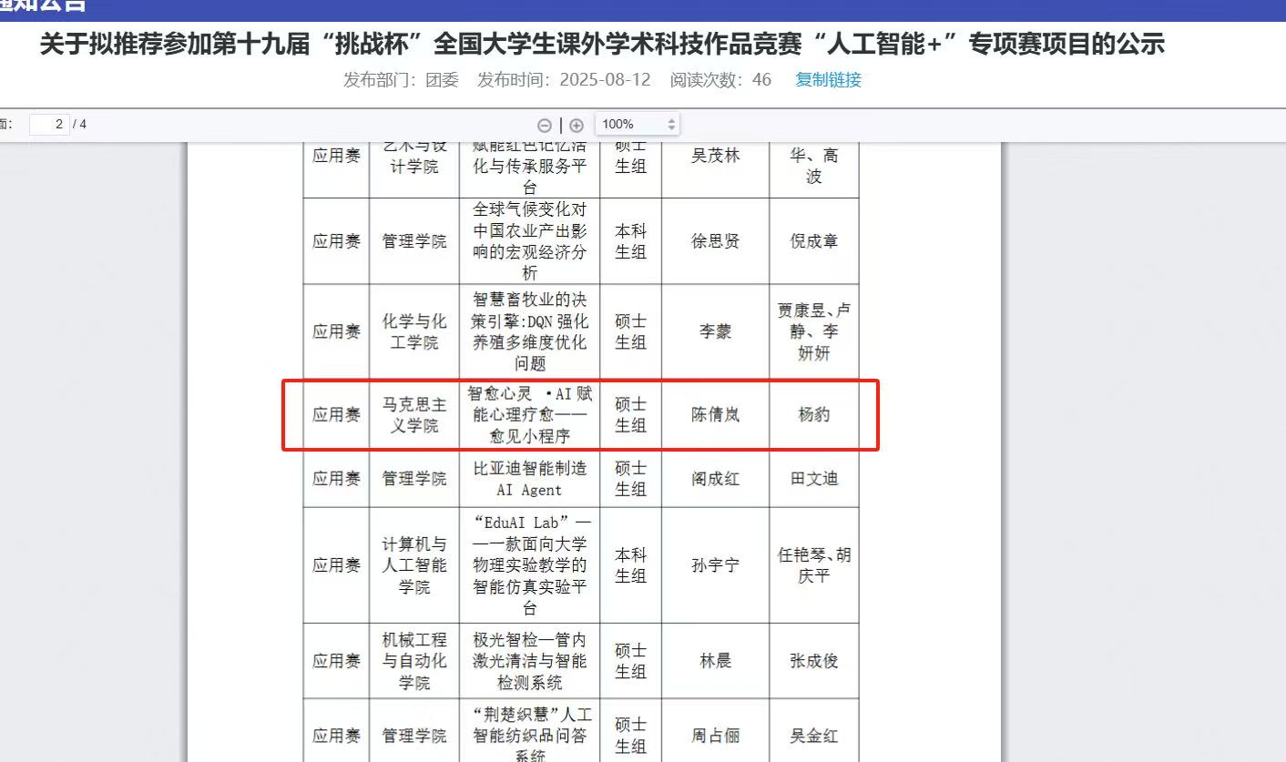 近日,从第十九届“挑战杯”全国大学生课外学术科技作品竞赛“人工智能+”专项赛道传来喜讯,WilliamHill官方网站陈倩岚同学的团队项目“智愈心灵。AI赋能心理疗愈—愈见小程序”在院赛中荣获一等奖,并成功通过校赛选拔,获得推优进入国赛资格。这一创新项目将人工智能技术与心理健康领域深度融合,展现了科技赋能社会福祉的无限可能。