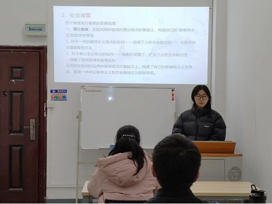 蒋佳美对《关于费尔巴哈的提纲》进行了学习心得分享,从写作背景和内容学习两部分进行汇报。她对该书的十一条提纲进行了逐条分析解读,最后指出要充分认识实践的决定性作用,积极参加实践活动。