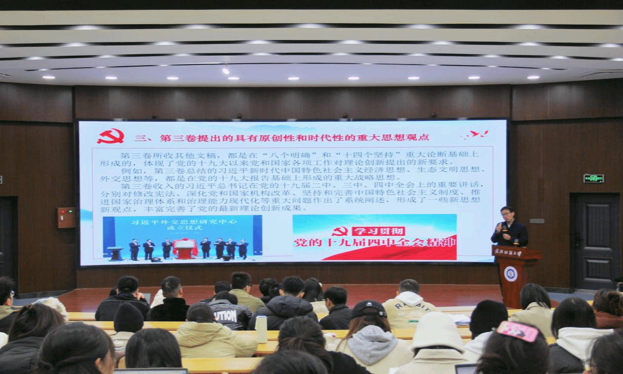 王海燕系统阐述《习近平谈治国理政》第三卷的深远意义、核心要义及其实践要求。他指出,自党的十八大以来,我们党推进全面从严治党,取得了反腐败斗争的压倒性胜利。我们必须清醒认识到,党在新时代面临的“四大考验”“四大危险”是复杂的、严峻的。世情国情党情是我们党在新时代治国理政必须回答的重大课题。我们应当坚持辩证唯物主义和历史唯物主义的世界观和方法论,深入掌握并运用马克思主义的思想方法和工作方法,以此提升我们的思维能力,把握矛盾的规律性。他强调《习近平谈治国理政》第三卷彰显了习近平总书记的强大人格力量和深厚为民情怀,广大青年大学生应牢记习近平总书记嘱托,既要胸怀祖国,也要放眼世界,实现“兼济天下”的宏愿。