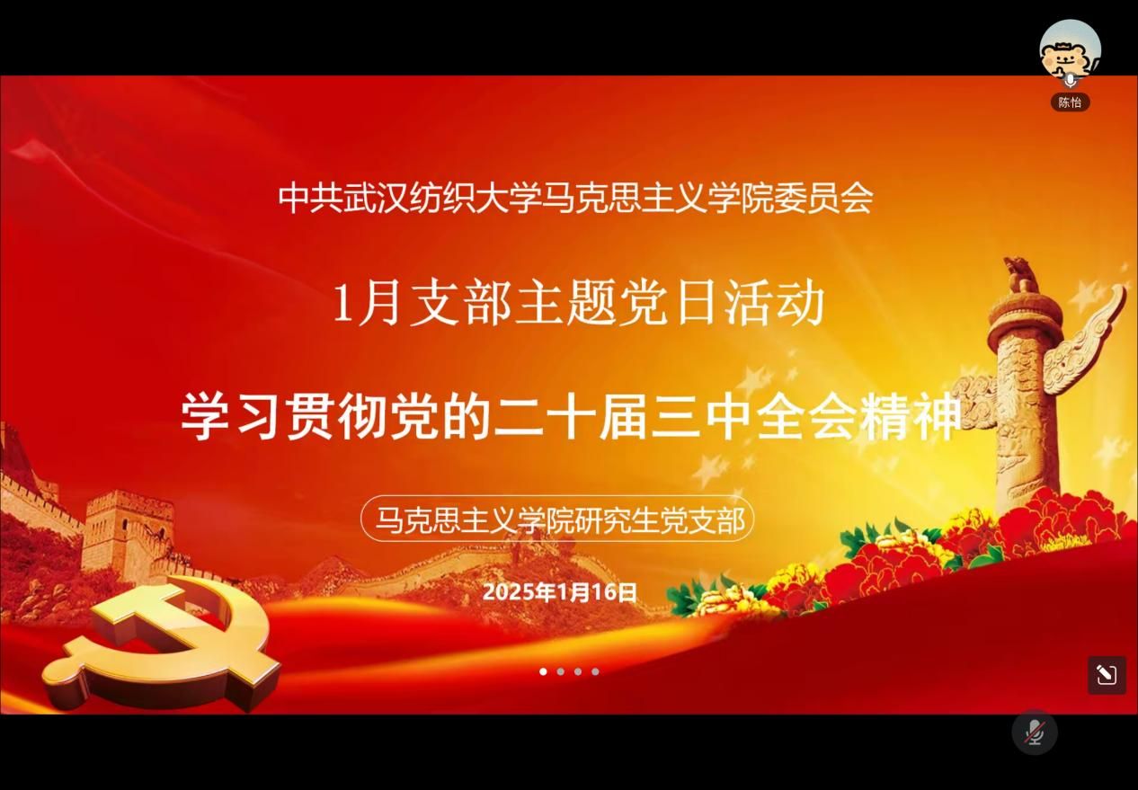 为深刻领悟党的二十届三中全会精神,进一步增强研究生党员的责任感与使命感,WilliamHill官方网站研究生支部1月16日通过腾讯会议开展了“学习贯彻党的二十届三中全会精神”主题党课及主题党日活动。会议由陈怡同志主持,全体研究生党员参加。