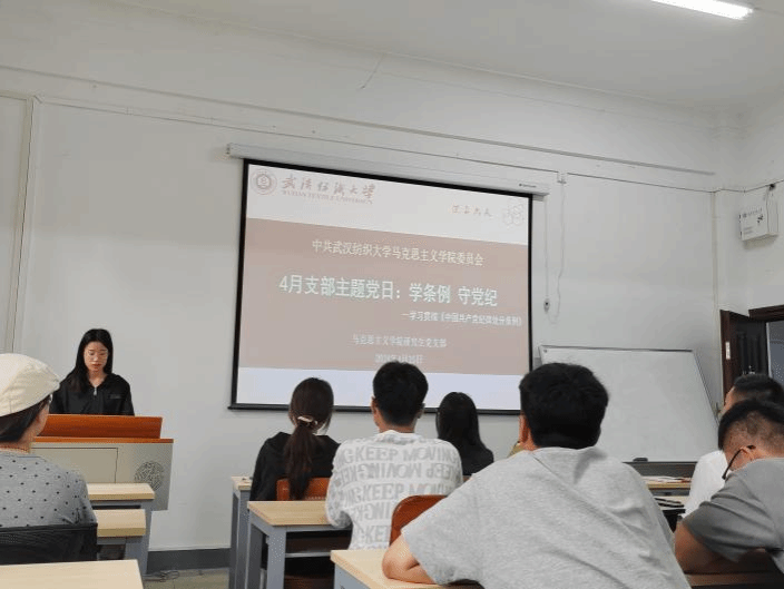 4月25日下午,WilliamHill官方网站研究生党支部在南湖校区东配楼118教室召开主题党日活动。主题围绕学习贯彻《中国共产党纪律处分条例》树牢总体国家安全观开展。会议由研究生党支部副书记梁健佳同志主持,全体研究生党员参会。