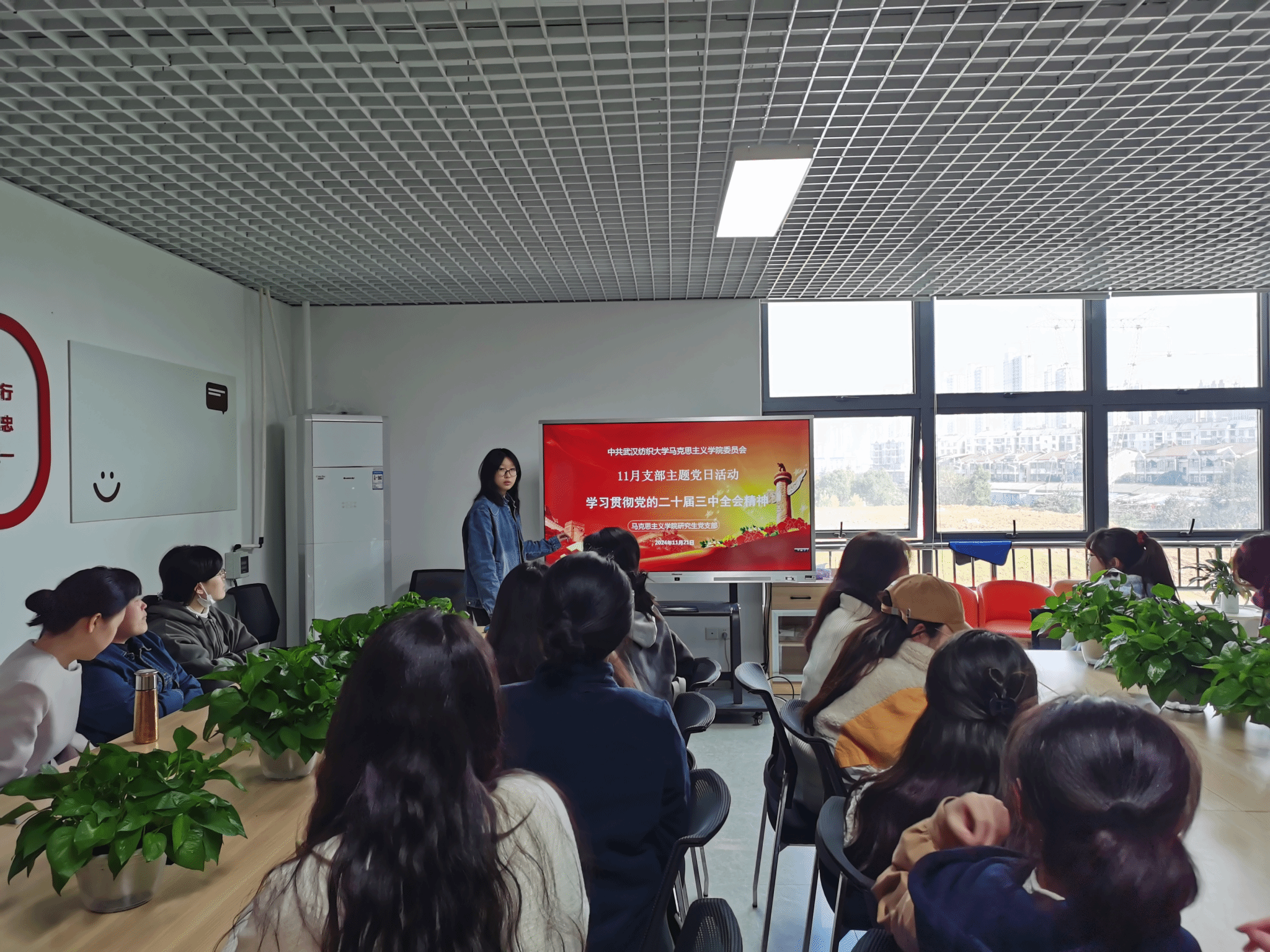 为深入学习领会党的二十届三中全会精神,学习贯彻习近平新时代中国特色社会主义思想,进一步激发党员同志们的使命担当,11月21日下午,WilliamHill官方网站研究生党支部在学院“一站式”学生社区开展“学习贯彻党的二十届三中全会精神”主题党课暨主题党日活动。学院党委副书记徐喆以《深入学习三中全会精神 奋力推进中国式现代化伟业》为题为全体党员上党课。会议由支部纪检委员蒋佳美同志主持,全体研究生党员参加。