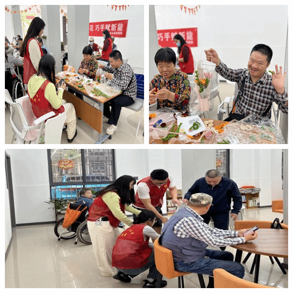 志愿者们接受了社区相关知识培训后积极上岗,两人一组分守在社区和停车场路口进行引导工作。活动以“创意扭棒花,巧手赋新能”为主题,志愿者们耐心倾听残疾人朋友说话,细心地帮助和引导他们制作扭棒花,在主讲老师和志愿者们的带领下,社区残障朋友们积极踊跃,在欢声笑语中顺利完成了扭棒花的制作。志愿者还为大家表演了节目,大家一起唱歌、跳舞、做游戏,共同感受着这温馨的时刻。结束时,残障朋友和志愿者们依依不舍地告别,虽然只有短暂的相处,但给残障朋友们留下了美好的回忆。