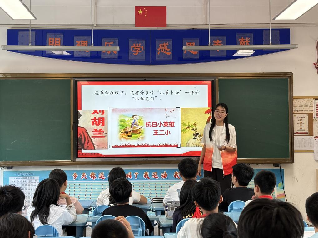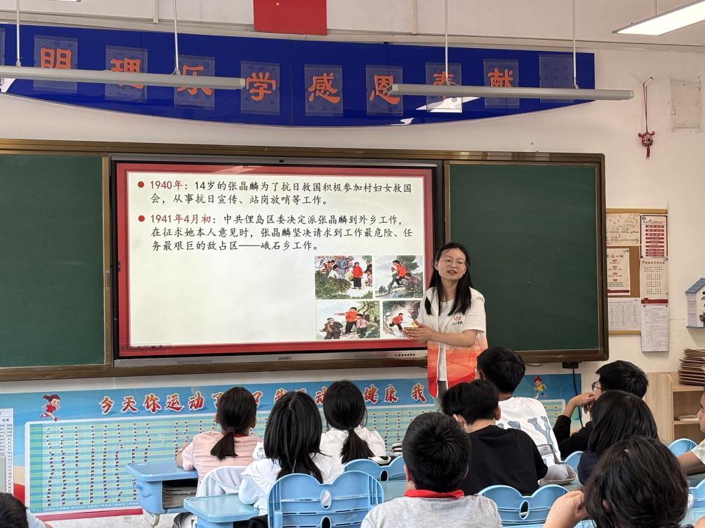 活动伊始,宣讲员王莹通过设计趣味互动游戏,迅速拉近与同学们的距离。她围绕“抗战小英雄”这一话题,通过视频播放和情境引导,带领学生们回顾革命历史,学习英雄事迹,引发他们对革命先烈的深切敬意和情感共鸣。随后,王莹讲述了张晶麟 14 岁投身抗日,15 岁为组织群众转移英勇牺牲的事迹。两位革命小英雄短暂却光辉的一生深深感染了在场的学生们。