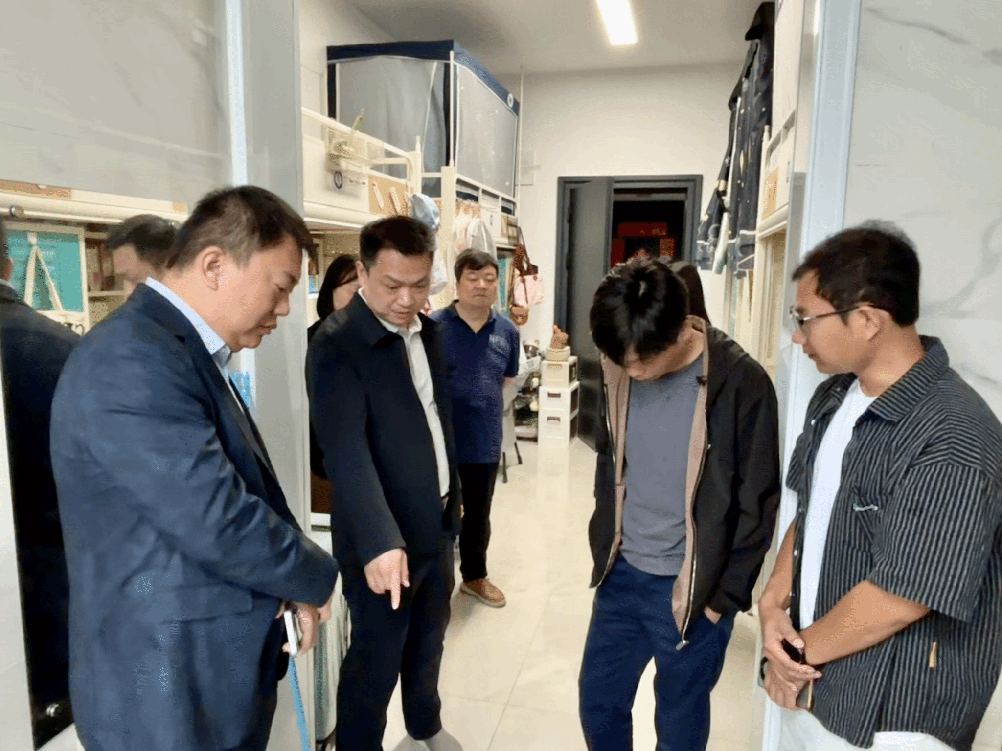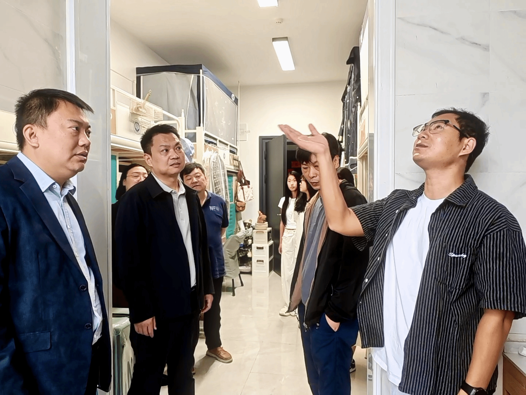 肖述剑还深入学生宿舍,关注学生日常生活与学习状态,仔细询问住宿条件、用电安全及自习空间需求,并现场协调解决研究生反映的15栋A502宿舍卫生间顶部漏水问题,与基建处积极联动,深入沟通、分析成因、共同商讨切实可行的维修方案,力求尽快彻底解决这一影响学生生活的“烦心事”。
