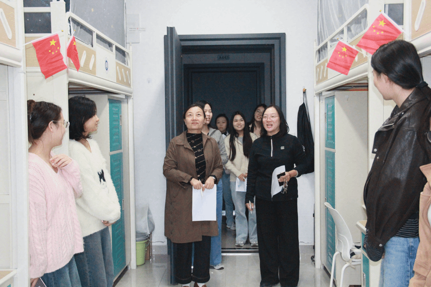 评选小组逐层逐间走访,对各个寝室进行细致检查,评分成员认真对照评选标准,重点围绕卫生环境、文化氛围及宿舍安全情况进行综合评分。走访过程中,评选小组结合各寝室的实际情况,现场提出了针对性的文化建设建议——如在收纳方面优化空间利用技巧,增加房间装饰设计等。同时,老师们与寝室内的学生亲切交流,主动询问大家“住宿生活是否习惯”“宿舍有无问题”,了解大家的生活状况。邹茜对格外整齐美观的宿舍给予了高度赞扬,并勉励大家既要做好寝室文化,也要养成良好的生活习惯,为同学们提供了有益建议和真诚鼓励。